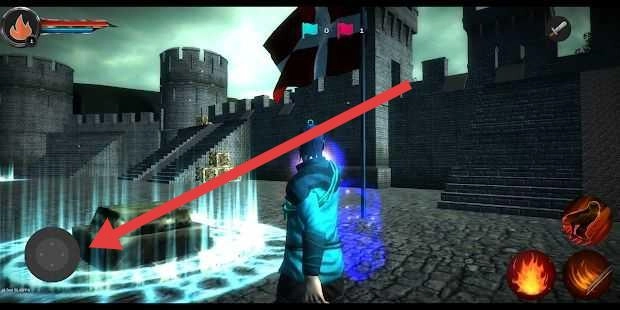 3、战斗场景中,拖动左侧的虚拟摇杆来操控角色移动,让角色靠近城堡区域,为触发战斗或进行探索任务做好准备。