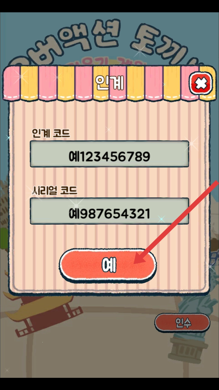 2、在弹出的界面中填写【예123456789】和【예987654321】,然后点击下方红色的【예】按钮进行提交。