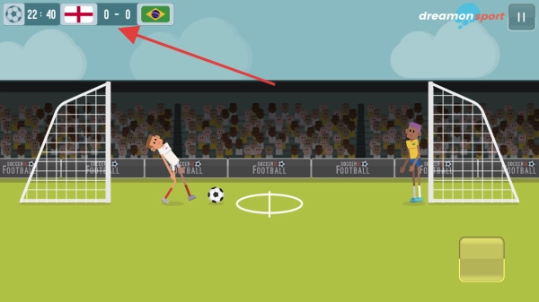 3、当球靠近球门时,操控球员发起射门,避开守门员的封堵,借助场地空间,抓住22:40这一时机,打破0-0的僵局完成得分。