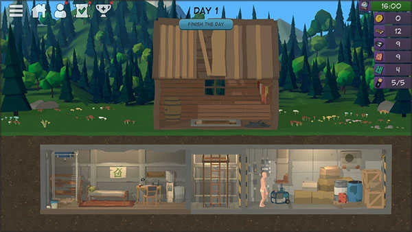 到了晚上,回到庇护所睡觉,点击右上方的时钟可以加快时间。