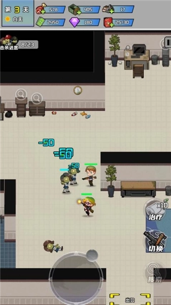 1、在游戏场景里要留意第3天、白天这类时间信息以及资源数值,通过操控角色使用治疗、切换等按钮来和僵尸战斗,同时关注击杀进度。