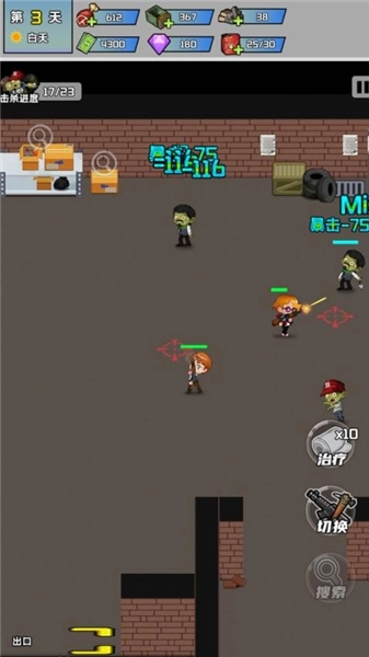 2、在后续的战斗进程里,留意角色攻击产生的伤害数值(例如-75)以及暴击时的提示信息(例如暴击-75),通过合理的移动走位来避开僵尸的攻击。