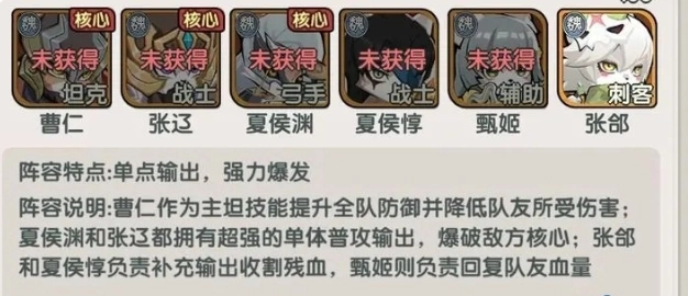 2、单体爆发流派,核心培养张辽,夏侯渊作为副核,凭借单点秒杀的能力,实现对敌方目标的逐个击破