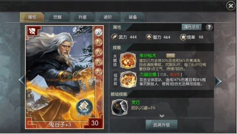 第一个前排,鬼谷子!在游戏的红将里,他算是比较容易获取的一位了。作为红将,他的各项属性在所有武将中都很突出!鬼谷子通常被安排在前排,这和他的兵种以及技能特点有关。首先,他率领的是步兵,这类兵种本身就适合在前排作战;再看他的技能,大部分都偏向防御类型,虽然也有一定的伤害输出,但核心作用还是在于防御,所以前排位置对他来说再合适不过了。