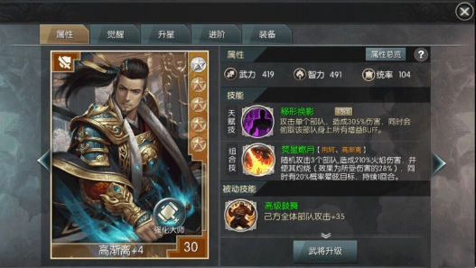 高渐离也是一名橙将,他的属性与技能和其他橙将相比其实没什么太大差异。之所以推荐他而非其他橙将,是因为他能和荆轲一同激活组合技“焚星燃月”。和前面提到的红将组合技比起来,这个技能的打击目标只有三个,伤害也低了不少,但也还算不错了,毕竟红将的培养难度相当高。