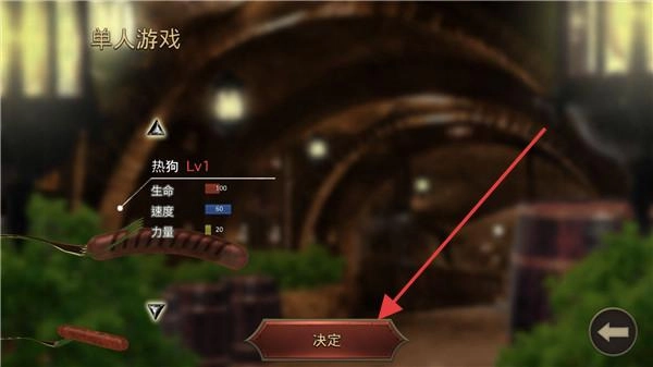 在单人游戏模式下,选择“热狗Lv1”这一选项,查看其属性信息后点击【决定】按钮,即可进入战斗环节,届时将由香肠角色参与战斗。