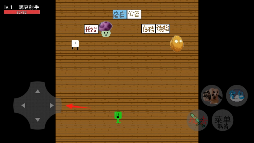 在木质地图场景中,玩家可借助虚拟摇杆操控移动,与“商店”“公告”等功能性建筑进行交互,并完成存档与读档的管理操作。