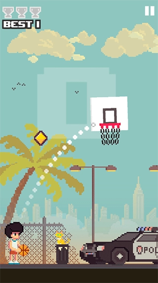 玩家需要操控小男孩完成投篮动作:按住屏幕时,小男孩与篮筐之间会自动生成一条投篮弧线,滑动手指可调整弧线的角度和跨度,松开手指后篮球便会顺着弧线轨迹飞出。若篮球成功入筐则得1分,若投篮失败则需重新开始游戏。