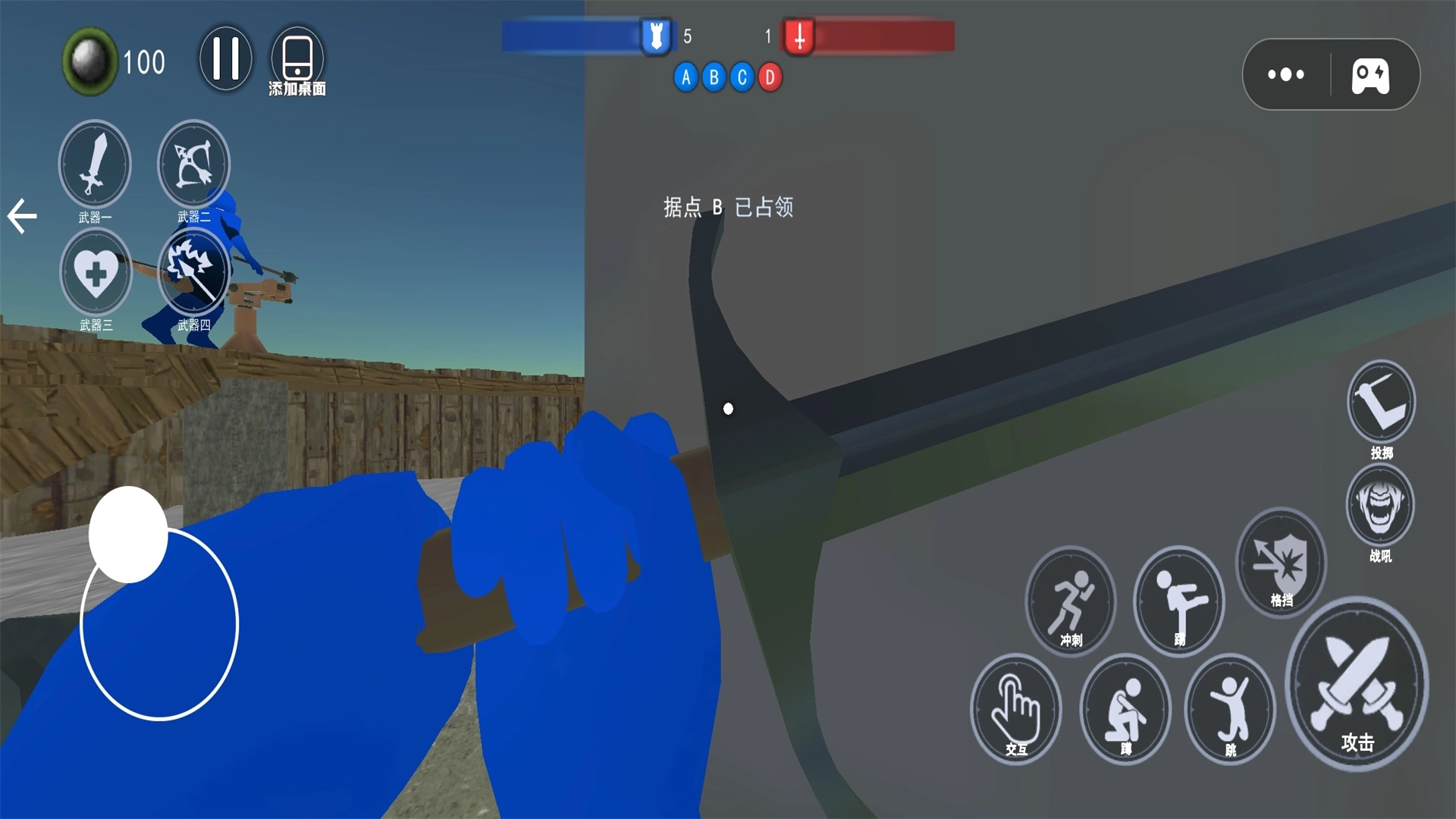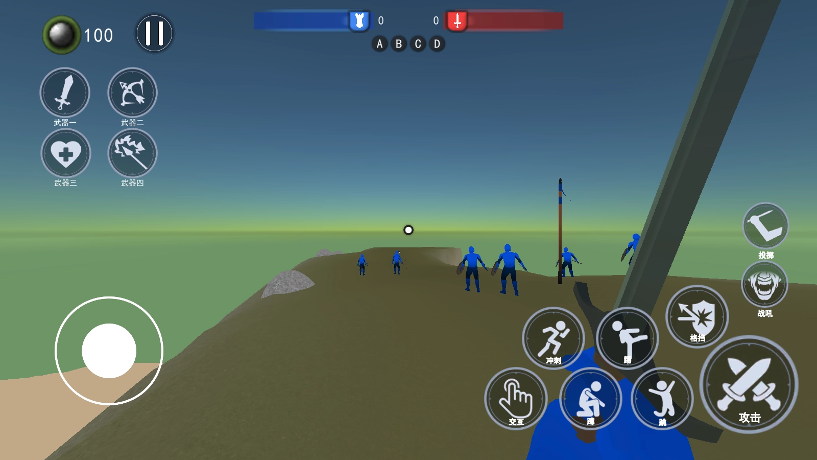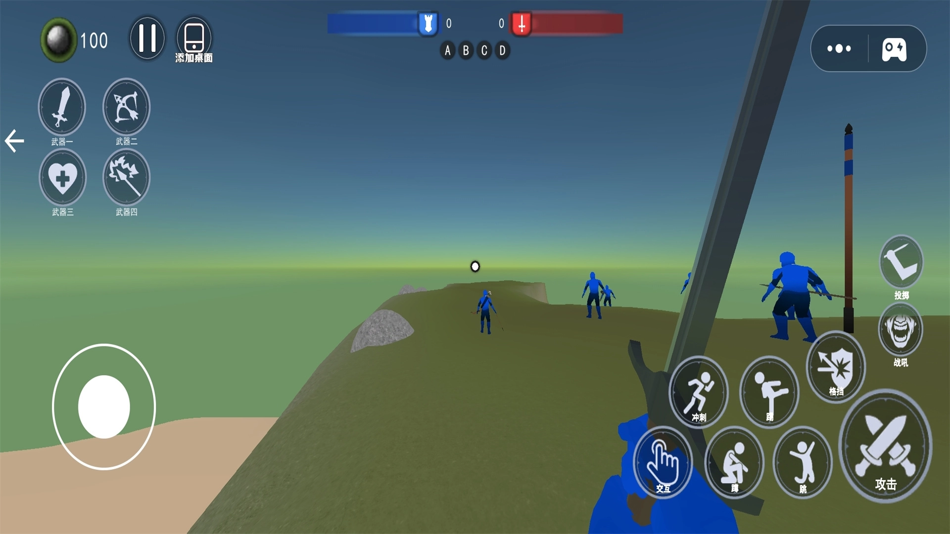 《红蓝战场战争》是一款以冷兵器时代为背景的策略战争游戏。在游戏中,玩家与NPC被划分为红蓝两大阵营,玩家将率领蓝方势力全力击溃红方军团。游戏采用第一人称战斗视角,玩家可自由选择各类冷兵器,在战场中展开敏捷作战,凭借灵活的走位与操作击杀红方士兵,当场上所有敌方士兵被消灭后即可获得胜利。冷兵器交锋带来的战斗体验更为爽快,同时也更考验玩家的战斗勇气!