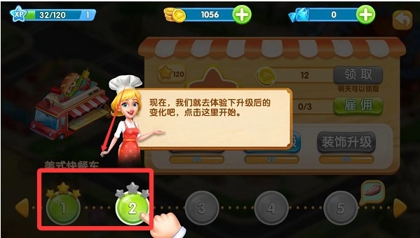 在游戏开局选定主店主题后,要先去采集基础食材,把第一道甜点解锁出来。之后根据每一关的具体要求,点击烹饪按钮,厨师就会自动完成甜点的制作和装盘工作了。