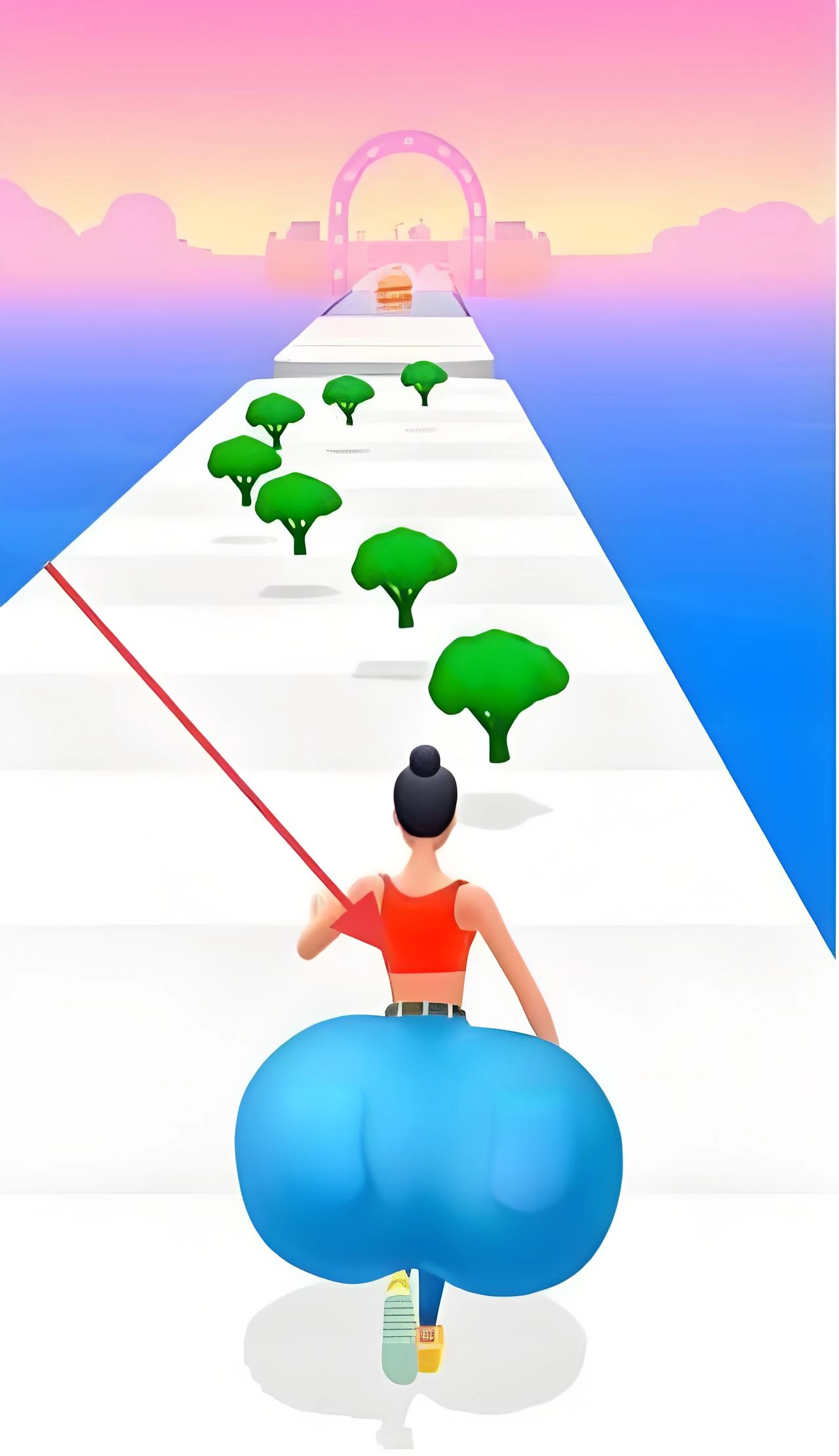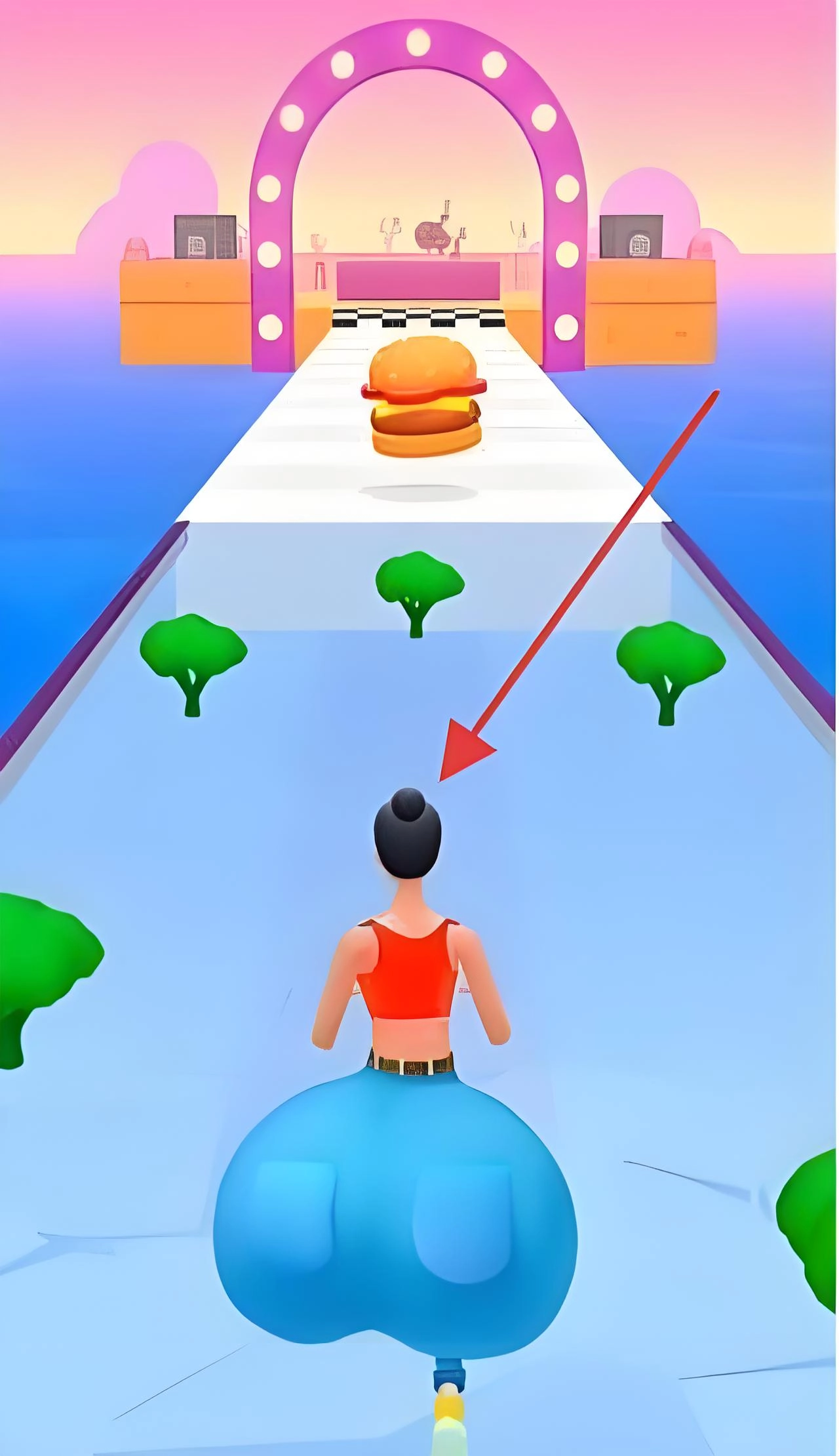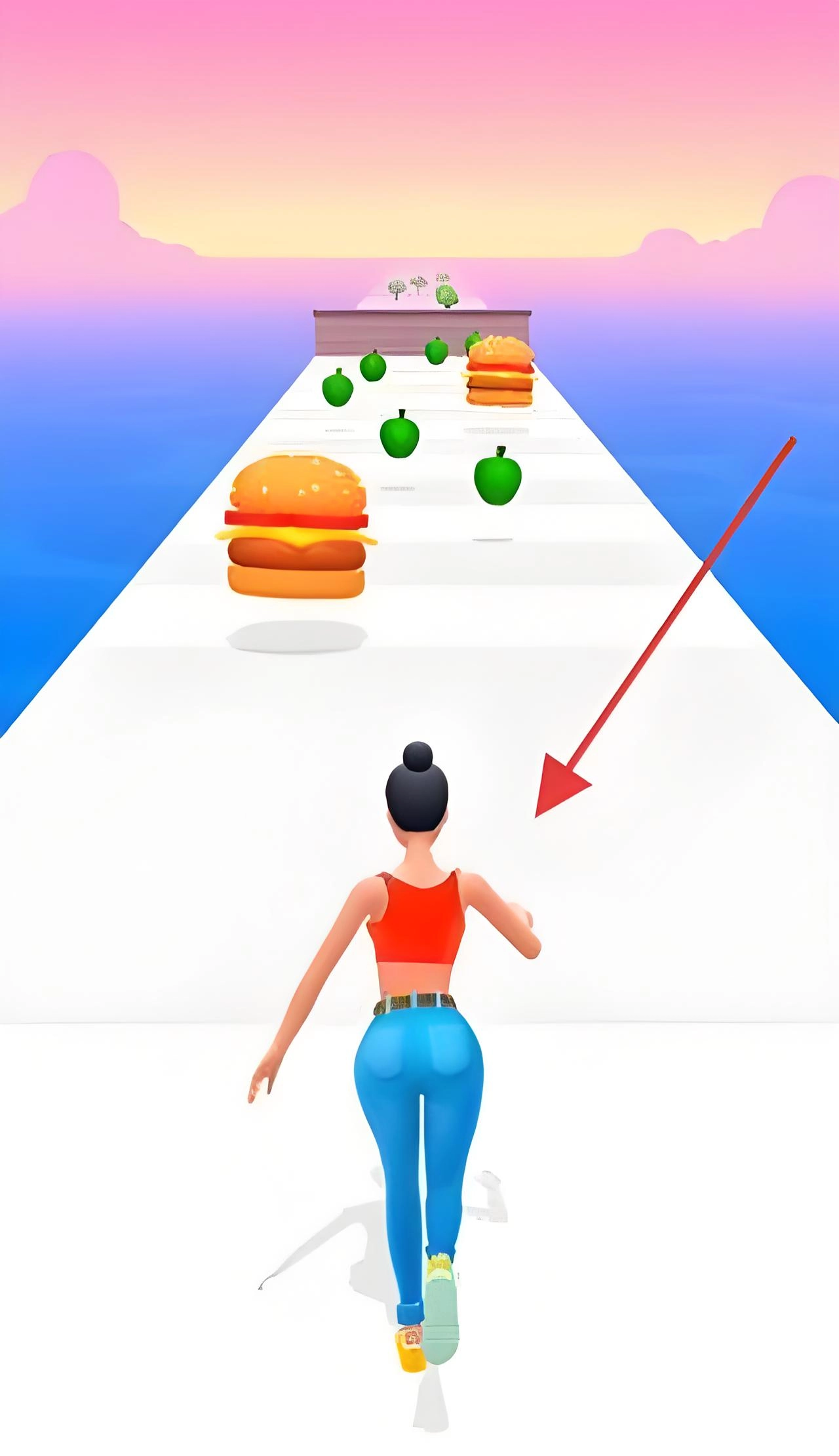临近关卡末尾,角色将面对拱门与汉堡的场景,此时需操控角色避开沿途干扰,借助收集健康食物后增长的体型,全力冲向终点,以此完成该关卡。