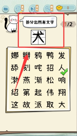 游戏开始时,先去熟悉汉字的组合规则,再按照题目给出的提示挑选合适的偏旁部首,试着拼出正确的成语,以此为后面的关卡闯关做好准备。