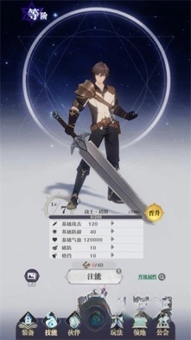 在左下方点击巨剑按钮就能给角色升级,每次升级要消耗的经验值不一样,等角色等级达到特定阶段就能晋升。