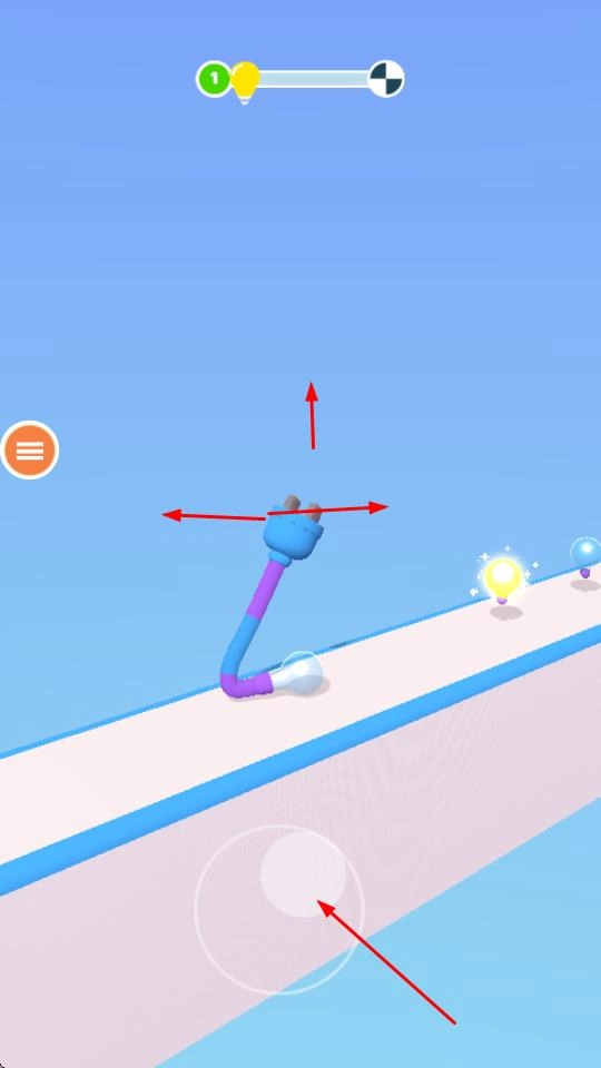 你操控着灯泡形状的角色在跑道上移动,收集散落在跑道各处的黄色灯泡,以此为角色自身补充电量。