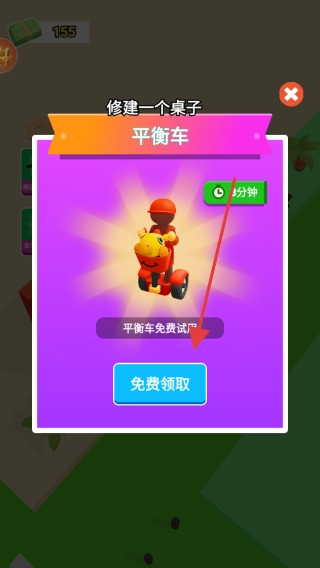 当游戏里弹出修建桌子的提示时,你可以选择免费获取平衡车之类的道具,这样能提高经营效率,让游戏进度更快推进。