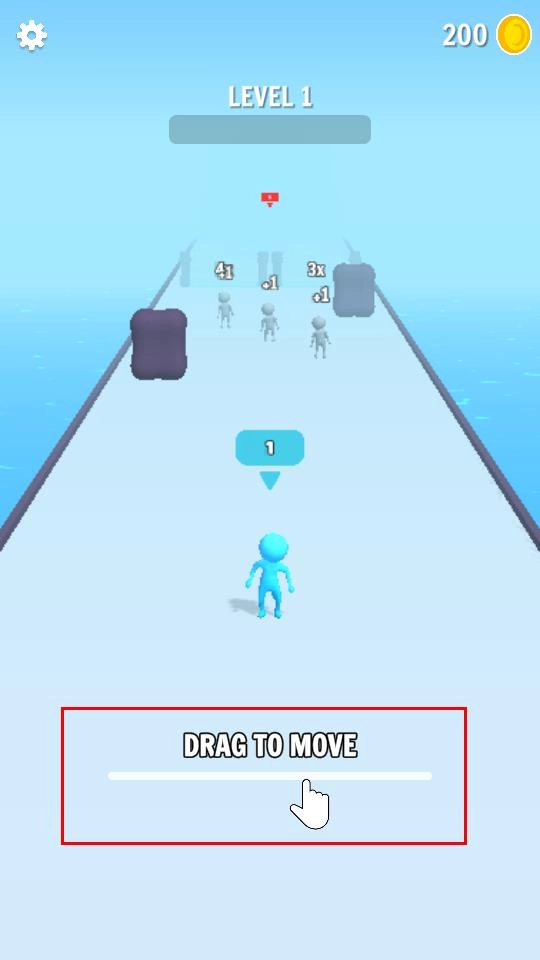 点击“DRAG TO MOVE”区域进行拖动操作,以此控制角色在通道内移动;途中收集数字来扩充队伍规模,为后续战斗积蓄力量,进而开启闯关进程。