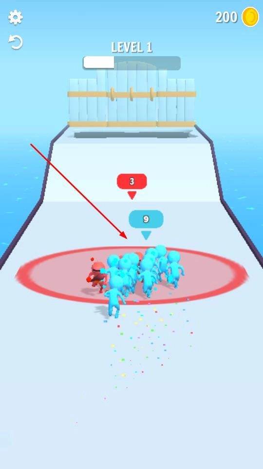 当遭遇敌人(例如红方角色)时,指挥己方壮大后的队伍对其实施包围并发起攻击。借助数量上的优势击溃对手,以此推进关卡的进程。