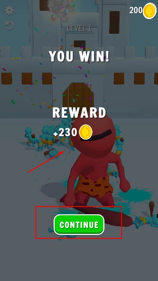 胜利后点击CONTINUE按钮领取金币奖励,即可无缝进入下一关,在新的通道里继续壮大队伍、挑战敌人。