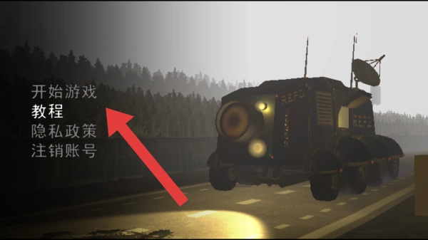 点击“开始游戏”按钮才能进入游戏场景,画面右侧停着带有R.E.P.U标识的车辆,当前处于初始选择界面,在这里可以进行开启游戏、查看教程等操作。