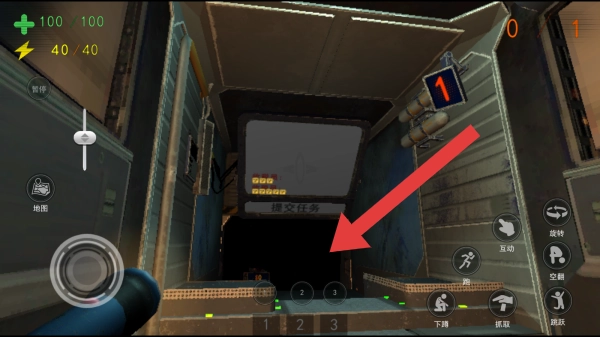 展示的是游戏内的场景,包含提交任务的提示,界面上能看到生命值、能量值等状态显示,同时设有地图、动作等操作按钮,整体呈现出科幻射击闯关的游戏玩法。
