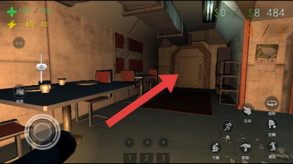 画面呈现室内场景,其中可见生命值与能量值的显示模块,还设有互动、下蹲等操作按钮,直观展现出探索与操作的环节。