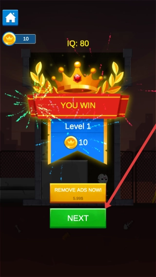 在Level-1成功通关后,点击NEXT按钮即可领取10金币奖励,并继续挑战下一关的游戏内容。