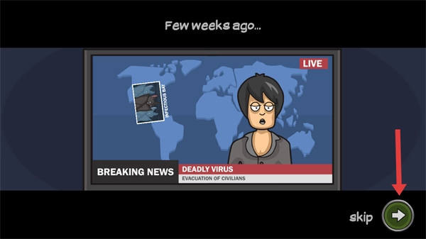 游戏开始时会呈现新闻剧情,点击【skip】按钮可跳过该剧情,从而快速进入实际操作游戏的环节。
