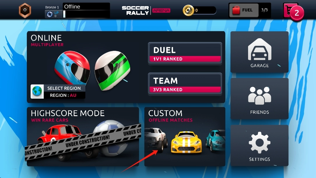 在Soccer-Rally-Arena游戏里,进入模式选择界面后,选个合适的游戏模式,就能开启汽车足球的竞技之旅啦。