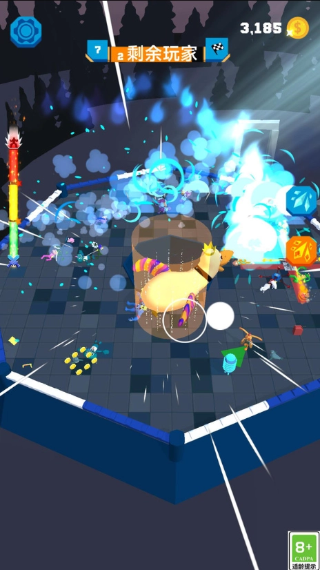 滑动控制角色移动,松开手指发动砸击攻击。 击败对手吸收能量,实现体型与力量的成长。 合理利用场景道具,制定以弱胜强的战术。