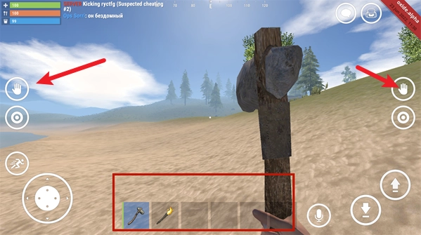 3、左右两边的小手是互动和攻击按钮,靠近猎物就能发起攻击,下方的快捷栏可自由切换武器。
