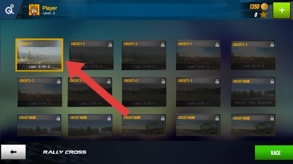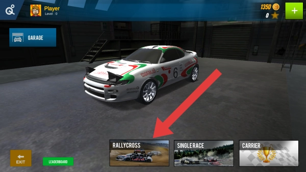 展示了游戏初始界面,下方设有RALLYCROSS、SINGLERACE、CARRIER三个选项,玩家可依据提示开展操作。