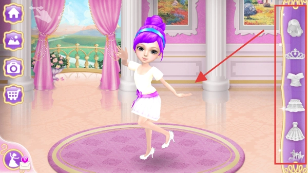 在穿搭界面里,从右侧的服装与饰品栏中挑选适配的服饰和饰品,为公主做搭配,塑造专属造型,增加公主的魅力值。