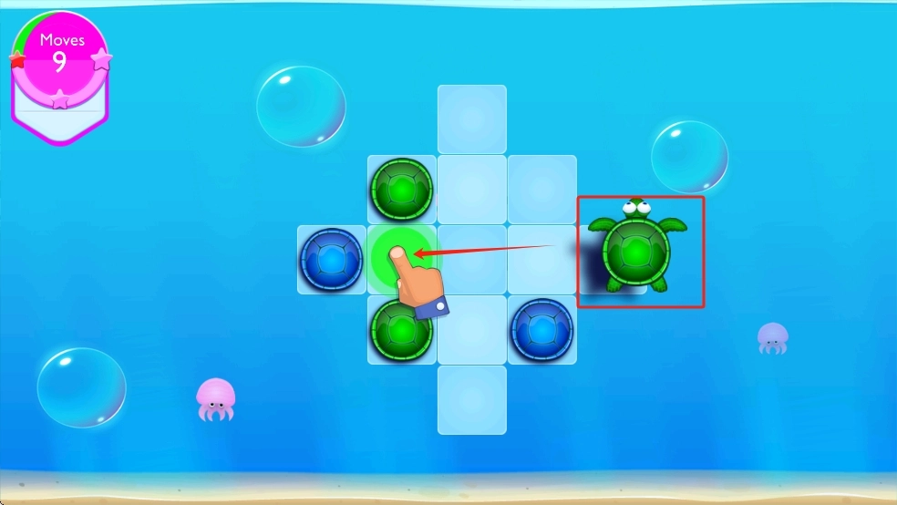 按照游戏指引操控绿色小球移动,操作时要灵活运用换位与消除规则,同时时刻关注剩余的9步操作次数,对每一步行动都进行精准规划。