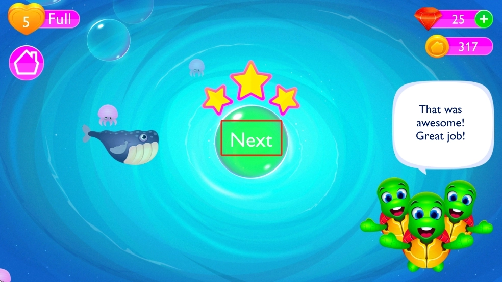 成功通关后点击绿色的Next按钮进入下一关,新关卡依旧是海洋主题的消除任务,继续通过消除小球积累金币和钻石。