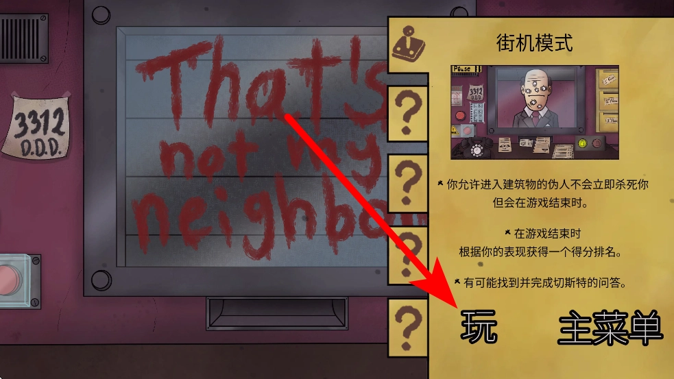 进入游戏后,你可以选择开启街机模式。在这个模式里,那些能够进入建筑物的伪人并不会马上发起攻击,不过在模式结束时会依据你的表现进行排名,而且还有机会完成切斯特的问答环节。