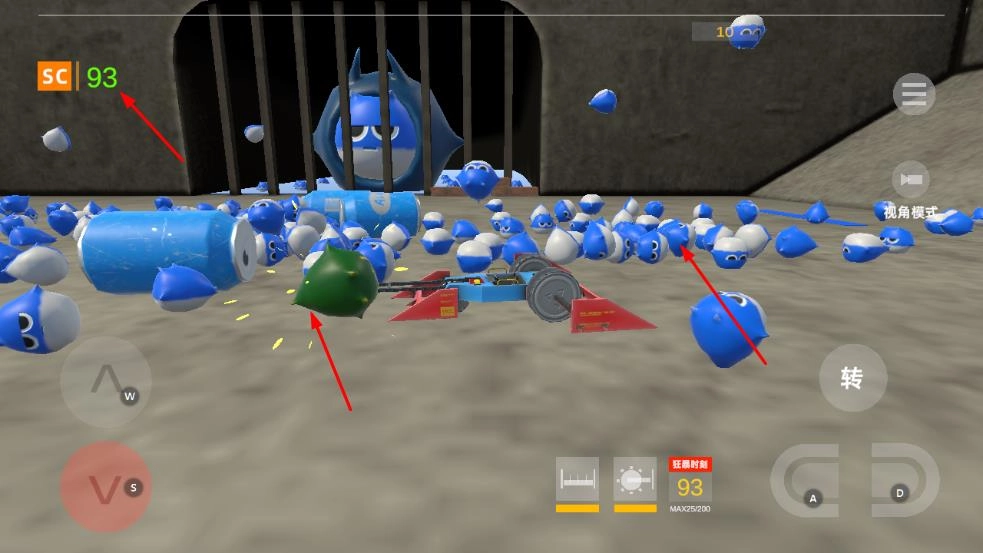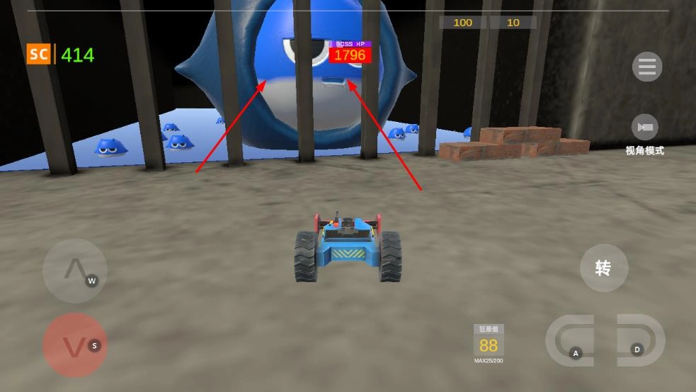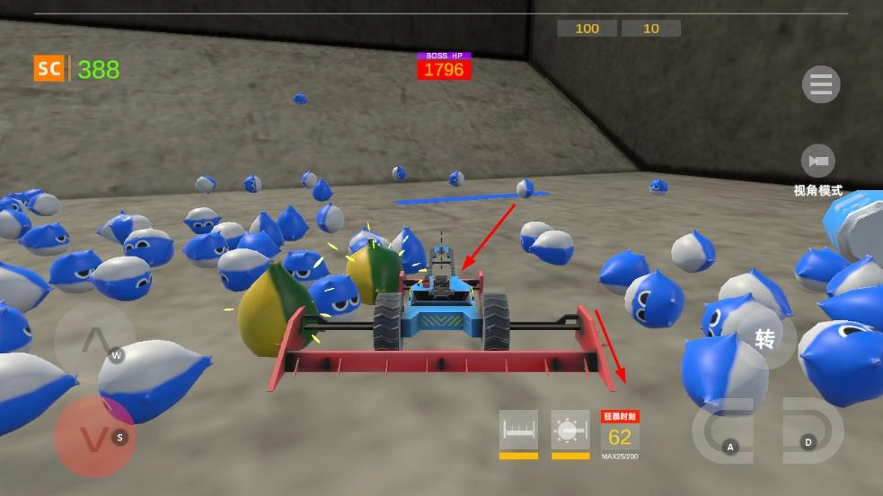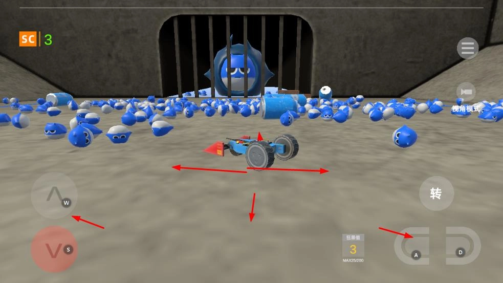 你可以通过W、S、A、D等按键来操控车辆在场景中移动,让车辆穿梭于蓝色小怪物之间。