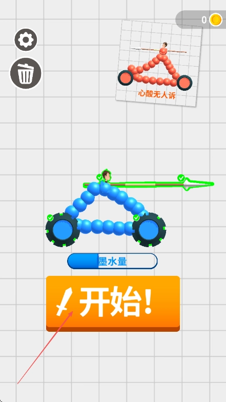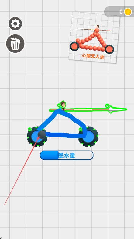可以参考界面右上方的示例图,在网格区域里,用有限的墨水量来绘制飞车的造型。