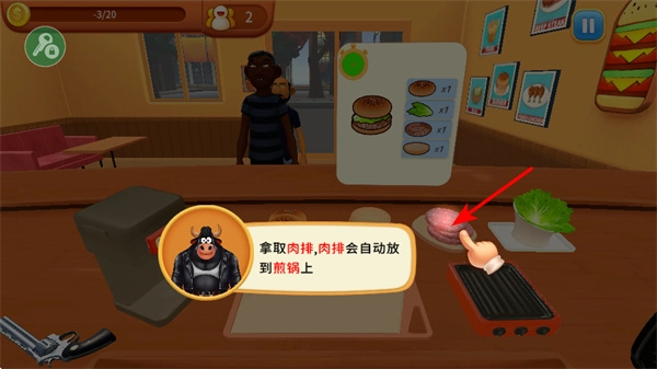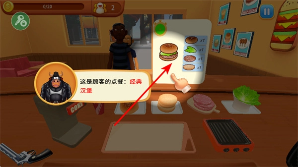 查看顾客的点餐提示(如经典汉堡),明确汉堡的组成成分,完成订单的基础环节,并识别对食材的具体要求。