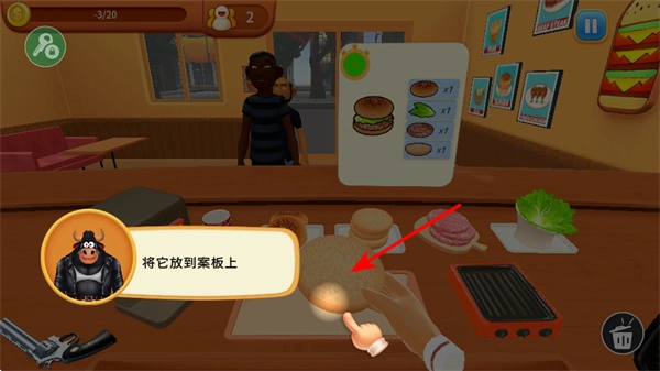 把汉堡胚放到案板上,这是做汉堡的第一步,要按顺序摆放食材,每一步操作都得准确,别被扣分。