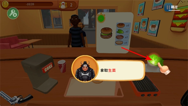 取出生菜,生菜是汉堡的配菜食材,按照订单的要求依次添加,完成汉堡的组装,然后交付给顾客,以此获取收益。