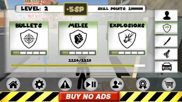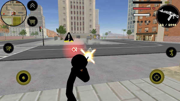 左侧控制移动与加速,右侧对应绳索、攻击(跳跃)和跳跃功能,右上方的武器切换以及血量、经验的显示均实时更新,信息一目了然。玩家可自由选择玩法,与其他帮派成员交火;击杀敌人能获取经验,击杀数量累积到一定程度会提升星级,届时警察及周边角色会重点针对你发起猛烈攻击。你的核心任务便是设法存活,并成功击杀其他目标。