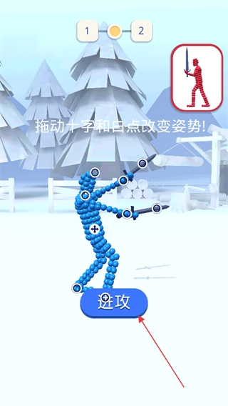 在关卡界面,按照提示拖动蓝色火柴人身上的十字与白点,来调整它的战斗姿势。