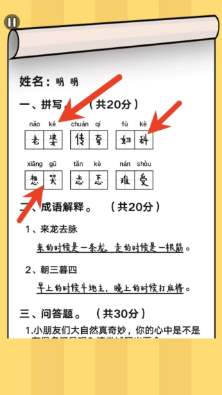 进入关卡后,系统会提供一份完整的小学生语文试卷让你审阅。