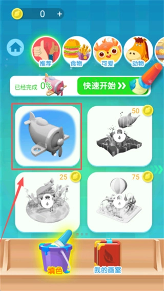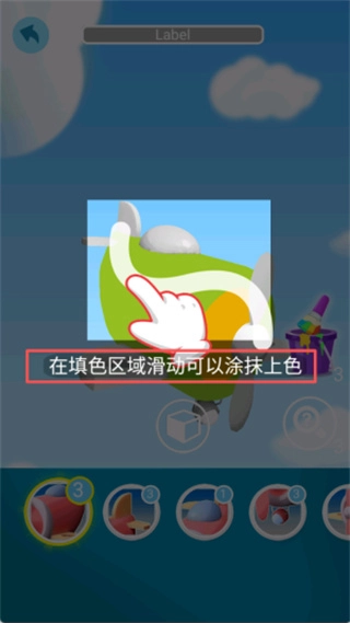 进入填色界面后,底部会出现五个颜色圆圈,你可以选择第一个红蓝相间的颜色,然后在飞机图案上滑动手指来完成上色操作。