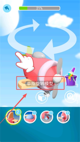给飞机涂色时,用一根手指按住屏幕上的飞机模型转动,这样就能调整角度,保证每个部位都能涂到。
