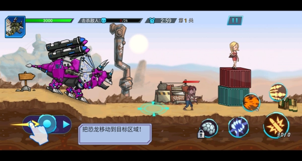 踏入第一关,按照指引将恐龙移至目标区域,开启热血战斗。