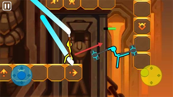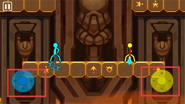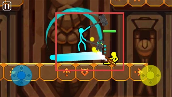 2、利用左侧【蓝色方向键】控制蓝色火柴人移动,右侧【黄色功能键】释放攻击技能。