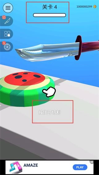1、进入【关卡4】,根据提示【按住可切割】,长按操作控制刀具,准备对西瓜物品进行切割。