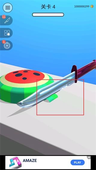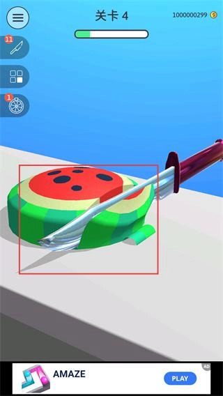 2、长按后刀具会向西瓜移动,接触物品后开始切割流程,推进【关卡4】的进度条。