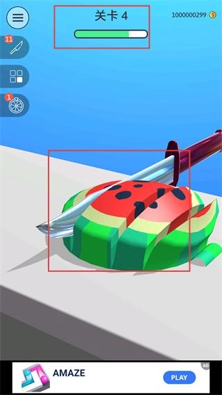 3、持续长按让刀具深入切割西瓜,【关卡4】的进度条会逐步填充,提升切割完成度。